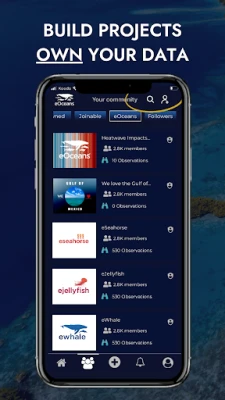 eOceans muudab koostöö lihtsaks ja turvaliseks. Liituge või jälgige projekte, suhelge meeskonnakaaslaste, vabatahtlike ja kogukondadega, tagades, et andmed on jagatud ja kättesaadavad õigetele inimestele. Määrates rollid ja load, hoiate alati kontrolli oma andmete üle. Kõik kogutud vaatlused muudetakse koheselt mõistetavateks ülevaadeteks. Hankige silmapilkseid kaarte, ajaseeriaid ja suundumusi oma pingutustest ja vaatlustest – ilma keerulise andmetöötluseta. Näete, mis toimub eri ökosüsteemides, projektides ja organisatsioonides, andes teile võime teha teadlikke otsuseid kiiremini ja tõhusamalt. Laiendage oma projekte nutikamalt, mitte raskemini, kasutades ühte rakendust kõigi mõõtmete jaoks ja viies kohalikud andmed vastavusse globaalsete prioriteetidega.